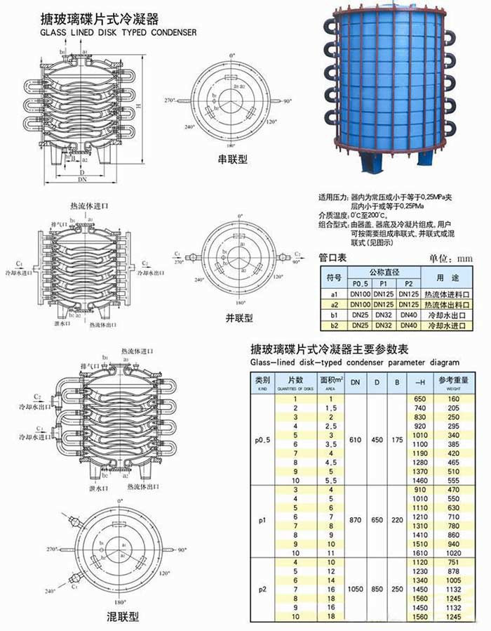 搪玻璃蝶片式冷凝器是將含硅量高的瓷釉涂于金屬表面,通過950℃搪燒,使瓷釉密著于金屬鐵胎表面制成。因此,它具有類似玻璃的化學穩定性和金屬強度的雙重優點。